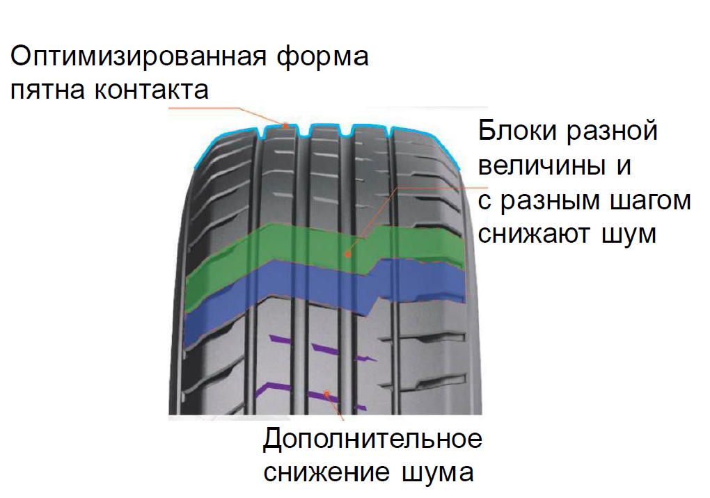 Оптимизированная форма пятна контакта и конструкция протектора способствуют лучшему отводу воды и повышают устойчивость на скользком покрытии. - Комфорт и низкий уровень шума