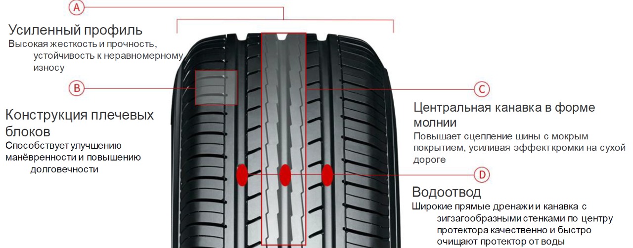 - Широкие продольные канавки эффективно отводят воду и снижают риск аквапланирования.